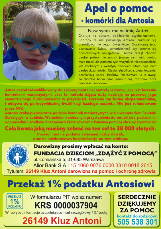 rally Opublikowano 1 Lutego 2017 Autor Zgłoś Udostępnij Opublikowano 1 Lutego 2017 Jeżeli ktoś ma wolny 1% i nie wie co z tym zrobić może przekazać ten procencik na leczenie mojego synka. Wszystkim darczyńcom serdecznie dziękujemy Dane do 1 % w wersji do skopiowania. Przekaż 1% podatkuW formularzu PIT wpisz numer: KRS 0000037904 W rubryce „Informacje uzupełniające - cel szczegółowy 1%” podaj: 26149 Kluz AntoniDla szybszej weryfikacji i księgowania wpłat bardzo prosimy nie wpisywać zdrobnień ani słów odmienionych przez przypadkijak również słów: dla, na, leczenie, rehabilitacja, itpSzanowni Darczyńcy, prosimy o zaznaczenie w zeznaniu podatkowym pola „Wyrażam zgodę”.________________________________________________________________________Darowizna Wpłaty prosimy kierować na konto:Fundacja Dzieciom "Zdążyć z Pomocą"Alior Bank S.A. 15 1060 0076 0000 3310 0018 2615Tytułem: 26149 Kluz Antoni darowizna na pomoc i ochronę zdrowia Cytuj Odnośnik do komentarza Udostępnij na innych stronach Więcej opcji udostępniania...