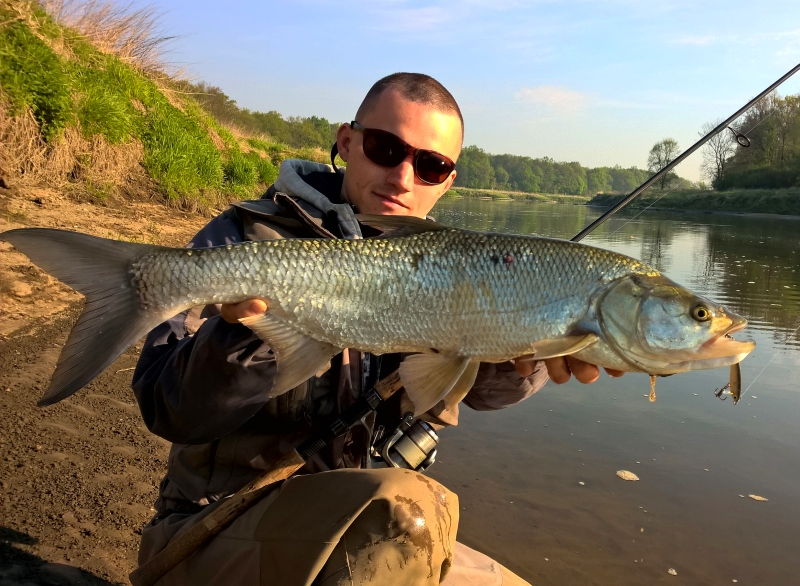 Chodząc brzegiem, z reguły mam jednego woblera na agrafce(np. boleniowego), a w zębach kleniową Brombę. Jest lotna i żyłka 0,22 mm jej i kleniom również, zupełnie nie przeszkadza, więc woblery sukcesywnie nimi żongluję. Łowiąc z wody mamy natomiast komfort zabrania dwóch kijów, jeden pod kątem kleniowania, a drugi boleni, ale to zupełnie inna para woderów ;)