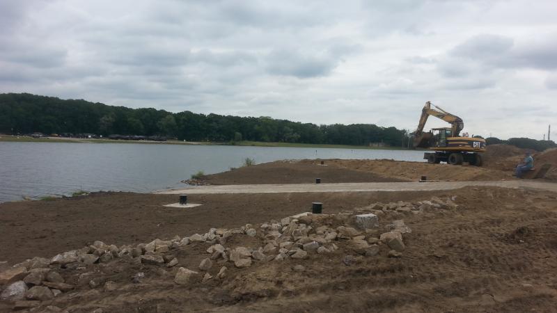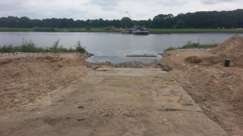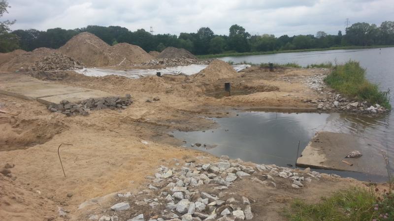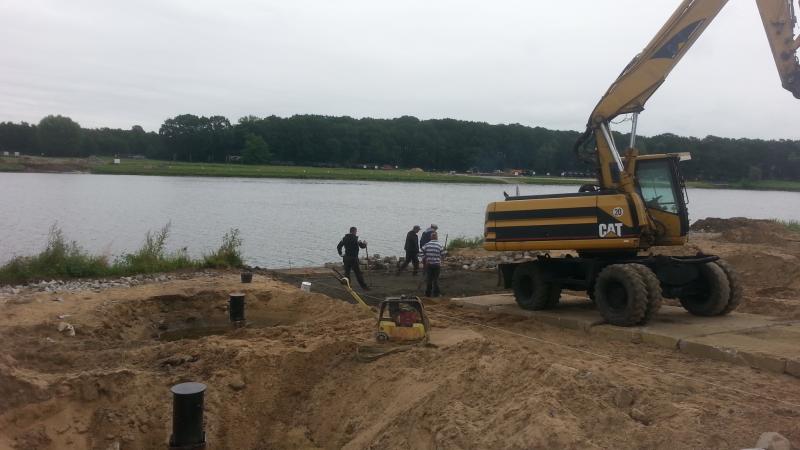 Zjazd na slipie jest już gotowy - położono kostkę granitową. Dzisiaj koparka niwelowała teren. Obok, po obu stronach slipu są jeszcze góry piasku, (pozostałość po wykopach). Nie wiadomo czy do weekendu wywiozą piach i gruz, ale myślę, że od weekendu, gdy nie będą prowadzone prace swobodnie łódeczkami można się już wodować.