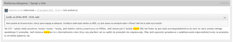 UncleZin Opublikowano 28 Listopada 2019 Zgłoś Udostępnij Opublikowano 28 Listopada 2019 Jezeli majfrend informuje, ze dostarcza dhl'em, a paczka jest spora. Czyli mozna przyjac, ze bedzie policzone clo albo jakies inne koszty? Jak to jest panowie?Poczytaj trochę od początku Były dyskusje na ten temat. Ale rozumiem, że wygodniej jest zapytać niż poszperać Wysłane z iPhone za pomocą Tapatalk Cytuj Odnośnik do komentarza Udostępnij na innych stronach Więcej opcji udostępniania...