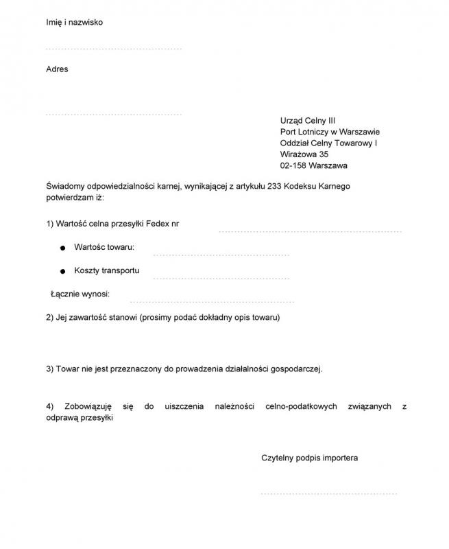 selk Opublikowano 22 Marca 2021 Zgłoś Udostępnij Opublikowano 22 Marca 2021 (edytowane) Z mojego doświadczenia FedEx jest zdecydowanie najmniej problematyczny ze wszystkich doręczycieli. Trzeba wypełnić tylko proste oświadczenie, żeby mogli dokonać odprawy w Twoim imieniu i nawet żadnych faktur nie trzeba przedstawiać.Z tego co pamietam to na osobe prywatna nawet oplaty pobrac nie powinni za dokonanie odprawy Wysłane z mojego SM-G973F przy użyciu Tapatalka Edytowane 22 Marca 2021 przez selk Cytuj Odnośnik do komentarza Udostępnij na innych stronach Więcej opcji udostępniania...