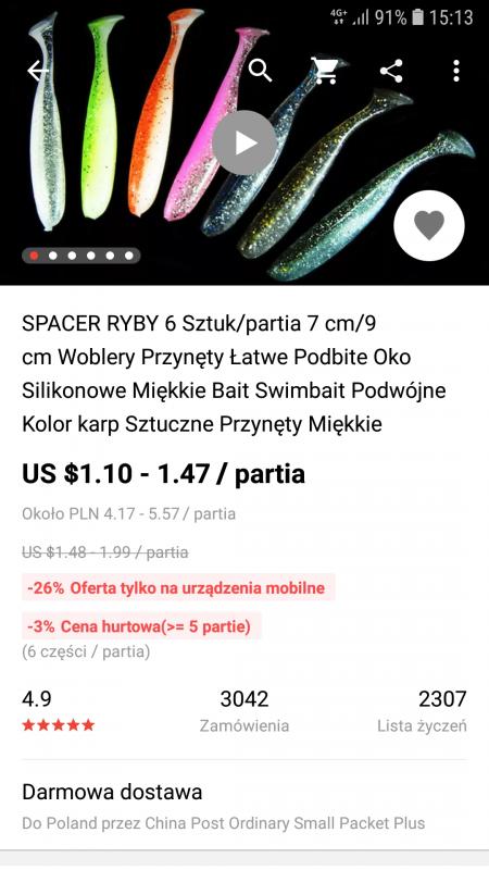 Sołtys Opublikowano 19 Czerwca 2018 Zgłoś Udostępnij Opublikowano 19 Czerwca 2018 Dotarła kolejna paczuszka od Meredith z gumkami,Te https://pl.aliexpress.com/item/MEREDITH-10PCS-5-5g-8cm-Lures-Fishing-Lures-Artificial-soft-Fishing-Baits-Cannibal-Fishing-Fish-Soft/32780468830.html?spm=a2g0s.9042311.0.0.3da25c0fCsECg7 są identyczne z cannibalami SG. te https://pl.aliexpress.com/item/MEREDITH-75mm-2g-20pcs-Lot-Fishing-Lures-Soft-Lures-Fishing-Soft-Bait-Bass-Bait-Swimbait-Craws/32809974628.html?spm=a2g0s.9042311.0.0.3da25c0fCsECg7 i te https://pl.aliexpress.com/item/Meredith-75mm-2-4g-20pcs-Wobblers-Fishing-Lures-Easy-Shiner-Swimbaits-Silicone-Soft-Bait-Double-Color/32799798770.html?spm=a2g0s.9042311.0.0.3da25c0fCsECg7 są delikatniejsze niż by obrazek sugerował raczej do zbrojenia pod offset albo delikatne główki na cienkich hakach. Natomiast te https://pl.aliexpress.com/item/MEREDITH-75mm-2g-20pcs-Lot-Fishing-Lures-Soft-Lures-Fishing-Soft-Bait-Bass-Bait-Swimbait-Craws/32809974628.html?spm=a2g0s.9042311.0.0.3da25c0fCsECg7 są "normalne" jeśli tak można powiedzieć, bardzo miękka guma mimo że dość gruba przy ogonku powinny dobrze pracować. Niczym nie śmierdzą, neutralny zapach bardzo pozytywne wrażenie. Tym razem szły 30 dni. Cytuj Odnośnik do komentarza Udostępnij na innych stronach Więcej opcji udostępniania...