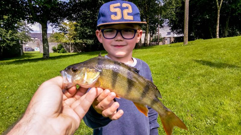 Po niedługim czasie Franek zacina (zwija) pierwszą w życiu samodzielnie złowioną rybe.