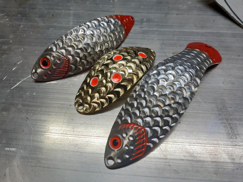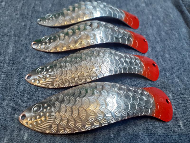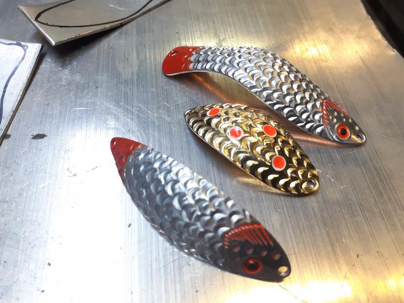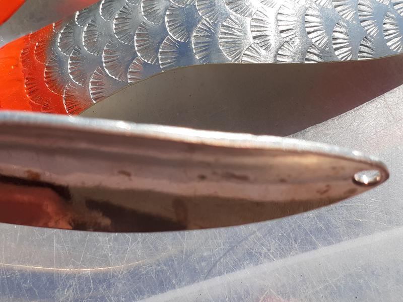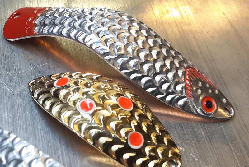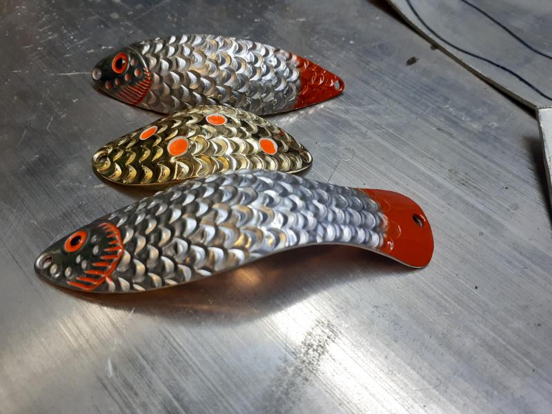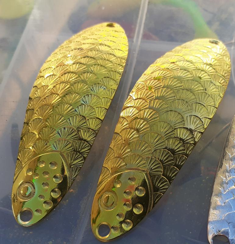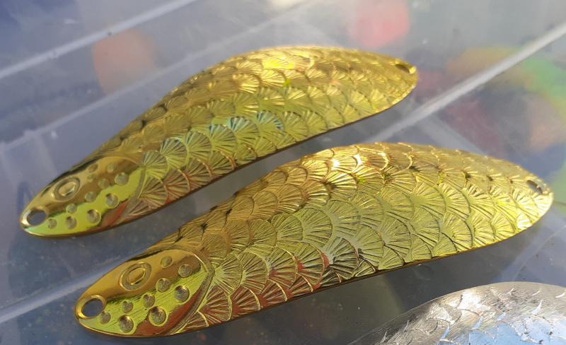 Delbanka Opublikowano 25 Czerwca 2021 Zgłoś Udostępnij Opublikowano 25 Czerwca 2021 Onegdaj otrzymałem od Jacka parę blaszek z głęboko wytłoczoną łuską. Wierzch lekko przetarłem drobnym papierem, "co by za bardzo się nie świeciły"- przepraszam Mistrzu. Po pewnym czasie wierzch ładnie spatynował a łuski pięknie przebłyskują. Co ważne spodnia część blachy jest gładka, pomimo głębokiego tłoczenia. Przy innych lekko tłoczonych blachach ciężko było nie zetrzeć powierzchni w tłoczeniach. Blaszki sprawdzały się zarówno w wodzie mocno trąconej jak i nie odstraszały ryb na prześwietlonej wodzie. Wrażenia - wnioski wysnute podczas połowu pstrągów i troci. 1 Cytuj Odnośnik do komentarza Udostępnij na innych stronach Więcej opcji udostępniania...