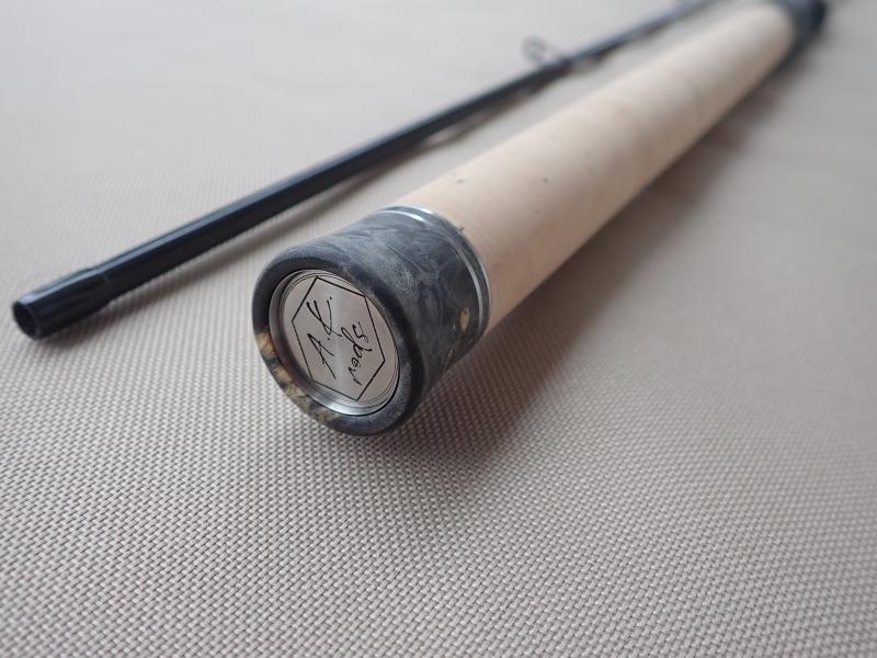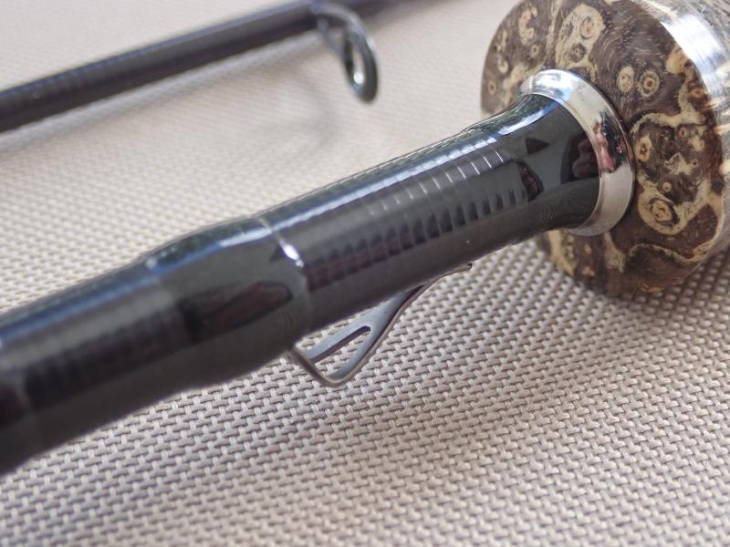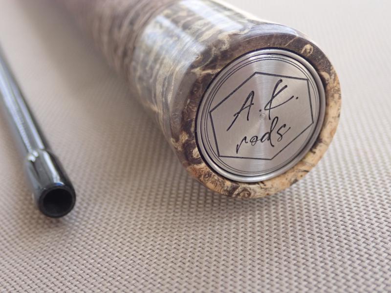 Matagi Super Mebaru L, przelotki Fuji T2, insert i wstawki stabilizowana czeczota klonu pod kolor tygrysa. Duperelki biżuteryjne ręcznie toczona i  polerowana stal 316 L.