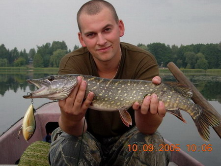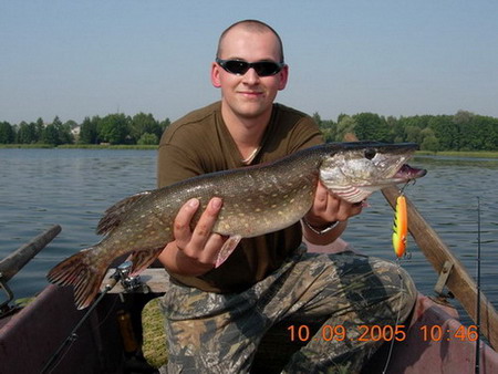 adasio Opublikowano 15 Września 2005 Zgłoś Udostępnij Opublikowano 15 Września 2005 w sobotę byłem z kolegą Piotrkiem nad narwią w okolicach Wierzbicy,wyłącznie jerkowaliśmy,ja dostałem trzy szczupłe 62cm 2kilo i kajtuś ze 30cm wzięły na slidera 10S RR,większy 72cm 3 kilo wziął na slidera 10S GT,kolega niestety o kiju,wczoraj również z Piotrkiem byliśmy na jeziorku Kamionkowskim,miałem fajne branie na poppera ale niestety po dwóch ruchach korbką ryba wypięła się z głośnym pluskiem,dziś znów byłem koło Wierzbicy z innym kolegą, ja jerkowanie on klasyczny spinning,u mnie totalna klapa,mało tego zerwałem mojego ulubionego slidera,koleżka wyjął kilka okoni i dwa malutkie szczupaczki,miał też na kijku jeszcze dwie większe sztuki (1,5-2kg)ale niestety w końcowej fazie holu mu się wypięły.jutro jeśli czas pozwoli pomacham trochę koło Wierzbicy a w sobotę w Ostrołęce(może ktoś z forum też będzie na tych zawodach ?)PS:dodaje zdjęcia moich dwóch szczupłych z soboty Cytuj Odnośnik do komentarza Udostępnij na innych stronach Więcej opcji udostępniania...