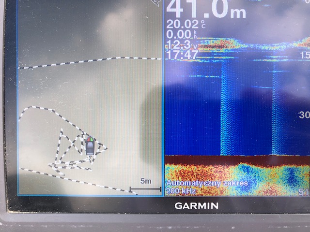 Tak grafika (wyślę dla zainteresowanych na priv) obrazuje jak działa funkcja kotwicy w tym silniku . Zbiornik Czorsztyn , słaby wiatr , kotwica załączona na 10 min !!! Skala 5 m i przesunięcia łodzi tak wielkie jak na zdjęciu. Nie łowiłem wtedy bo się nie dało ale generalnie jest to niemożliwe .