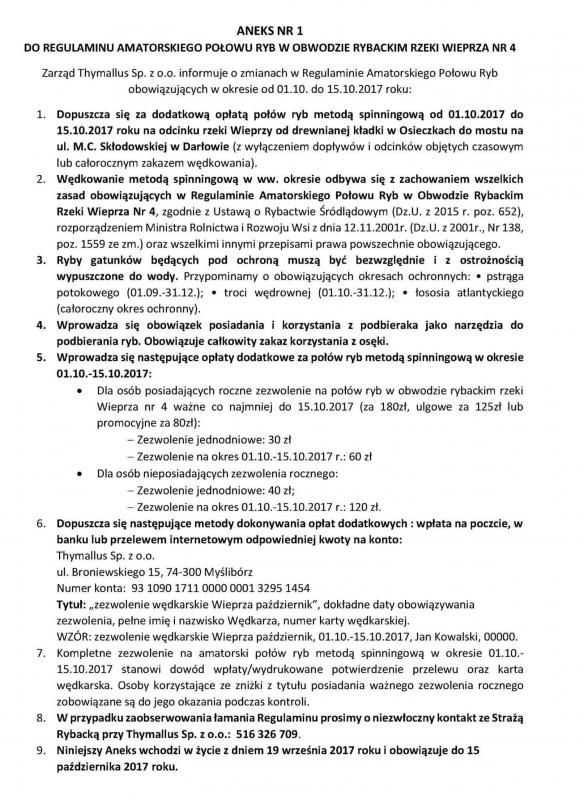 Kuballa44 Opublikowano 19 Września 2017 Autor Zgłoś Udostępnij Opublikowano 19 Września 2017 No dobra! A teraz oficjalnie! '' Informacja dla wszystkich Wędkarzy ????Podjęliśmy decyzję o przedłużeniu sezonu dla wędkarzy łowiących metodą spinningową do 15 października 2017. W okresie 01.10.-15.10. spinningistów obowiązywać będzie dodatkowa opłata oraz Aneks Nr 1 do Regulaminu Amatorskiego Połowu Ryb. Prosimy o dokładne zapoznanie się z Regulaminem i Aneksem i zapraszamy nad rzekę ???? ANEKS NR 1 DO REGULAMINU AMATORSKIEGO POŁOWU RYB W OBWODZIE RYBACKIM RZEKI WIEPRZA NR 4 Zarząd Thymallus Sp. z o.o. informuje o zmianach w Regulaminie Amatorskiego Połowu Ryb obowiązujących w okresie od 01.10. do 15.10.2017 roku: 1. Dopuszcza się za dodatkową opłatą połów ryb metodą spinningową od 01.10.2017 do 15.10.2017 roku na odcinku rzeki Wieprzy od drewnianej kładki w Osieczkach do mostu na ul. M.C. Skłodowskiej w Darłowie (z wyłączeniem dopływów i odcinków objętych czasowym lub całorocznym zakazem wędkowania). 2. Wędkowanie metodą spinningową w ww. okresie odbywa się z zachowaniem wszelkich zasad obowiązujących w Regulaminie Amatorskiego Połowu Ryb w Obwodzie Rybackim Rzeki Wieprza Nr 4, zgodnie z Ustawą o Rybactwie Śródlądowym (Dz.U. z 2015 r. poz. 652), rozporządzeniem Ministra Rolnictwa i Rozwoju Wsi z dnia 12.11.2001r. (Dz.U. z 2001r., Nr 138, poz. 1559 ze zm.) oraz wszelkimi innymi przepisami prawa powszechnie obowiązującego. 3. Ryby gatunków będących pod ochroną muszą być bezwzględnie i z ostrożnością wypuszczone do wody. Przypominamy o obowiązujących okresach ochronnych: • pstrąga potokowego (01.09.-31.12.); • troci wędrownej (01.10.-31.12.); • łososia atlantyckiego (całoroczny okres ochronny). 4. Wprowadza się obowiązek posiadania i korzystania z podbieraka jako narzędzia do podbierania ryb. Obowiązuje całkowity zakaz korzystania z osęki. 5. Wprowadza się następujące opłaty dodatkowe za połów ryb metodą spinningową w okresie 01.10.-15.10.2017:• Dla osób posiadających roczne zezwolenie na połów ryb w obwodzie rybackim rzeki Wieprza nr 4 ważne co najmniej do 15.10.2017 (za 180zł, ulgowe za 125zł lub promocyjne za 80zł):-Zezwolenie jednodniowe: 30 zł-Zezwolenie na okres 01.10.-15.10.2017 r.: 60 zł• Dla osób nieposiadających zezwolenia rocznego:-Zezwolenie jednodniowe: 40 zł;-Zezwolenie na okres 01.10.-15.10.2017 r.: 120 zł. 6. Dopuszcza się następujące metody dokonywania opłat dodatkowych : wpłata na poczcie, w banku lub przelewem internetowym odpowiedniej kwoty na konto: Thymallus Sp. z o.o. ul. Broniewskiego 15, 74-300 Myślibórz Numer konta: 93 1090 1711 0000 0001 3295 1454 Tytuł: „zezwolenie wędkarskie Wieprza październik”, dokładne daty obowiązywania zezwolenia, pełne imię i nazwisko Wędkarza, numer karty wędkarskiej. WZÓR: zezwolenie wędkarskie Wieprza październik, 01.10.-15.10.2017, Jan Kowalski, 00000. 7. Kompletne zezwolenie na amatorski połów ryb metodą spinningową w okresie 01.10.-15.10.2017 stanowi dowód wpłaty/wydrukowane potwierdzenie przelewu oraz karta wędkarska. Osoby korzystające ze zniżki z tytułu posiadania ważnego zezwolenia rocznego zobowiązane są do jego okazania podczas kontroli. 8. W przypadku zaobserwowania łamania Regulaminu prosimy o niezwłoczny kontakt ze Strażą Rybacką przy Thymallus Sp. z o.o.: 516 326 709. 9. Niniejszy Aneks wchodzi w życie z dniem 19 września 2017 roku i obowiązuje do 15 października 2017 roku.'' Chlopaki, wedki w dloń!Mala prośba. Nie bojcie sie dzwonic do nas w momencie gdy widzicie klusola, lub kogos kto zabiera rybę.W naszej gestii pozostaje jak najszybsza reakcja.Do zobaczenia! 1 Cytuj Odnośnik do komentarza Udostępnij na innych stronach Więcej opcji udostępniania...